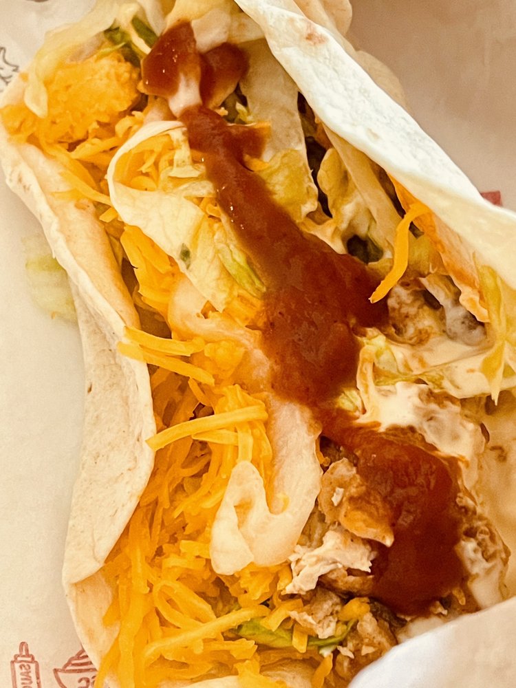 Freshly grilled, marinated chicken, savory secret sauce, crisp shredded lettuce, and fresh house-grated cheddar cheese, in a warm flour tortilla.
