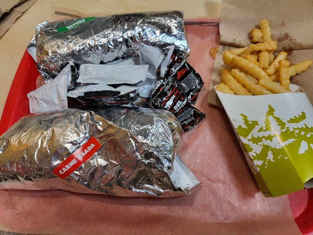 Our Crispy Jumbo Shrimp Burrito, plus out famous Crinkle Cut Fries, and a refreshing beverage.
