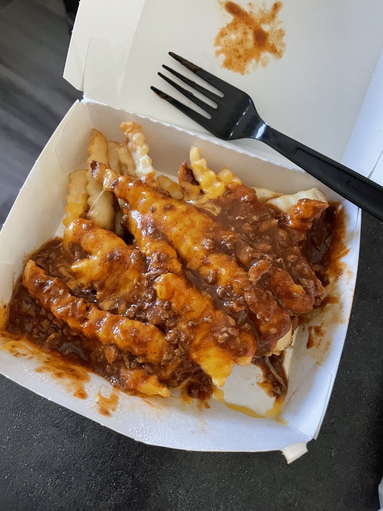 A classic favorite! Crinkle Cut Fries topped with beefy chili, freshly grated cheddar cheese, cool sour cream, diced onions, and fresh diced tomatoes.